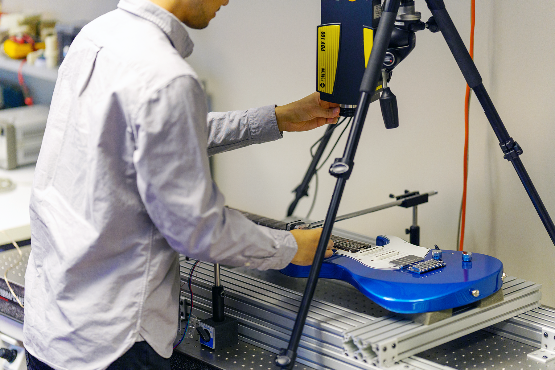エレキギターが発明されてから50年以上経った今でも、設計と音色の関係は完全には解明されていません。そこで我々は、材料や形状、加工方法といった設計パラメータがなぜ、どのように音に寄与するか、計測やシミュレーションを通して調査しています。そして、ここで得た知見をもとに、理想の音色を科学的に設計する手法を開発しています。