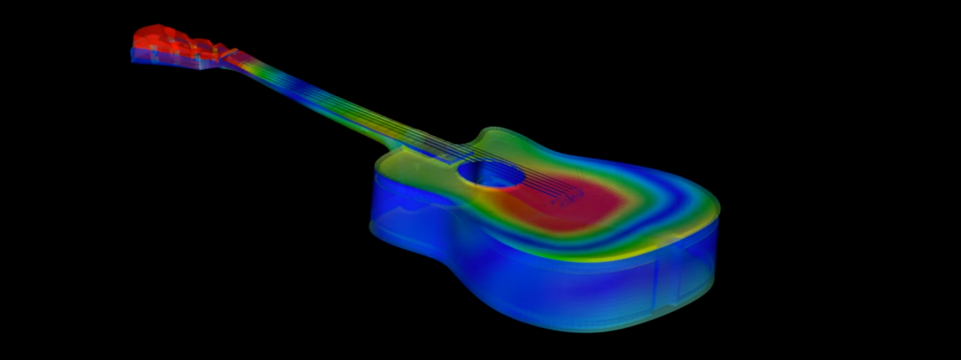 我々はギターを設計するための独自の振動・音響シミュレーション技術を開発しました。この技術によって、実際にギターを作る前にシミュレーションモデル上で仮想的にギターの振動・音響面の検討を行うことができるようになりました。
