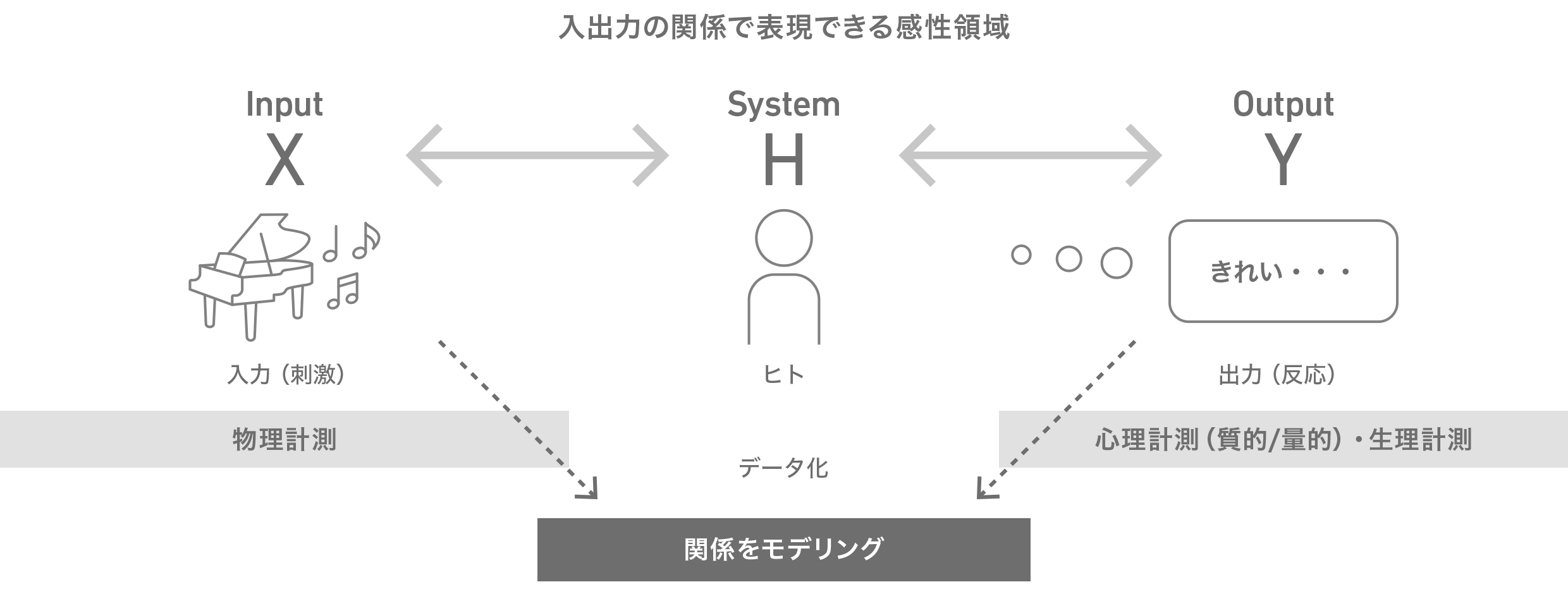 感性計測技術では、人にある刺激を「入力」した時に、その反応を「出力」とするシンプルなシステムを想定して人の感性をモデル化します。例えば、人が「楽器の音(入力)」を聴いた時に「きれい(出力)」と表現するシステムです。