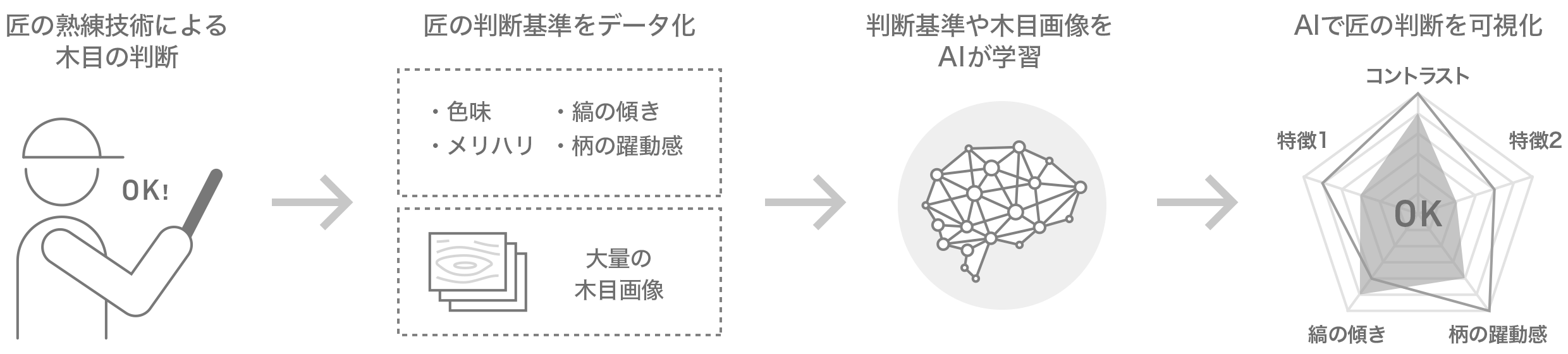 これらを実現するために、私たちはAIシステムを活用した検査技能の可視化に取り組みました。具体的には、木目の画像データと検査員の判断データを同時に機械学習モデルで学習させることで、検査員が持つ木目の良し悪しの判断に加え、その判断基準(木目の色合い、縞の形など)を可視化するAIシステムを構築しました。このAIシステムで可視化された判断基準は、生産現場で使えるヤマハ独自の基準になります。この基準をベースに、検査員がより安定かつ精緻な判断ができることで、さらなる生産工程の効率化や品質安定化を実現できます。さらに、ヤマハならではの価値や信頼性をお客様へ明確に提案することができます。このように、私たちはAI技術の支援によって匠の技をさらに高めることで、匠技能に裏付けられた高品質の製品を、お客様に提供し続けたいと考えています。