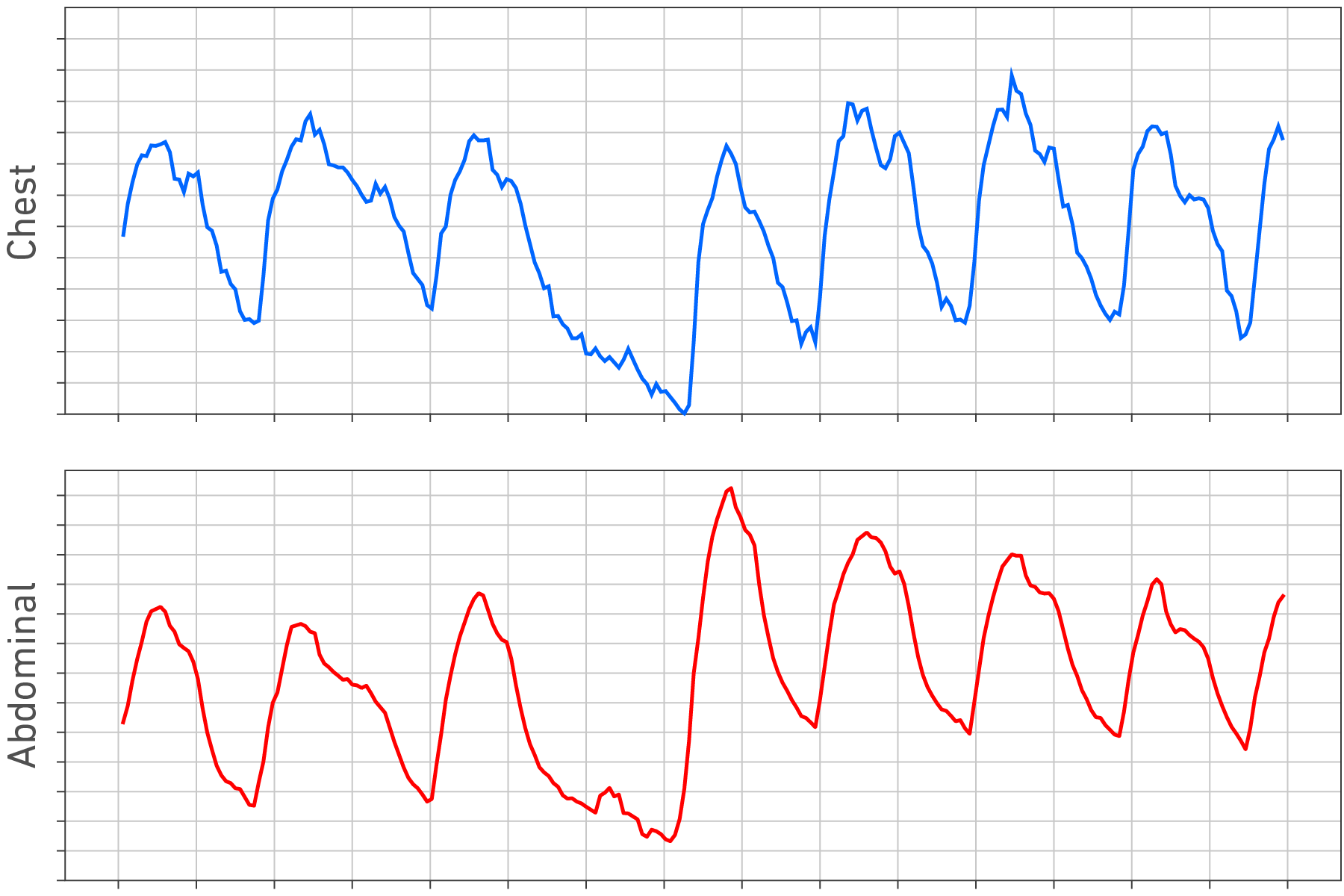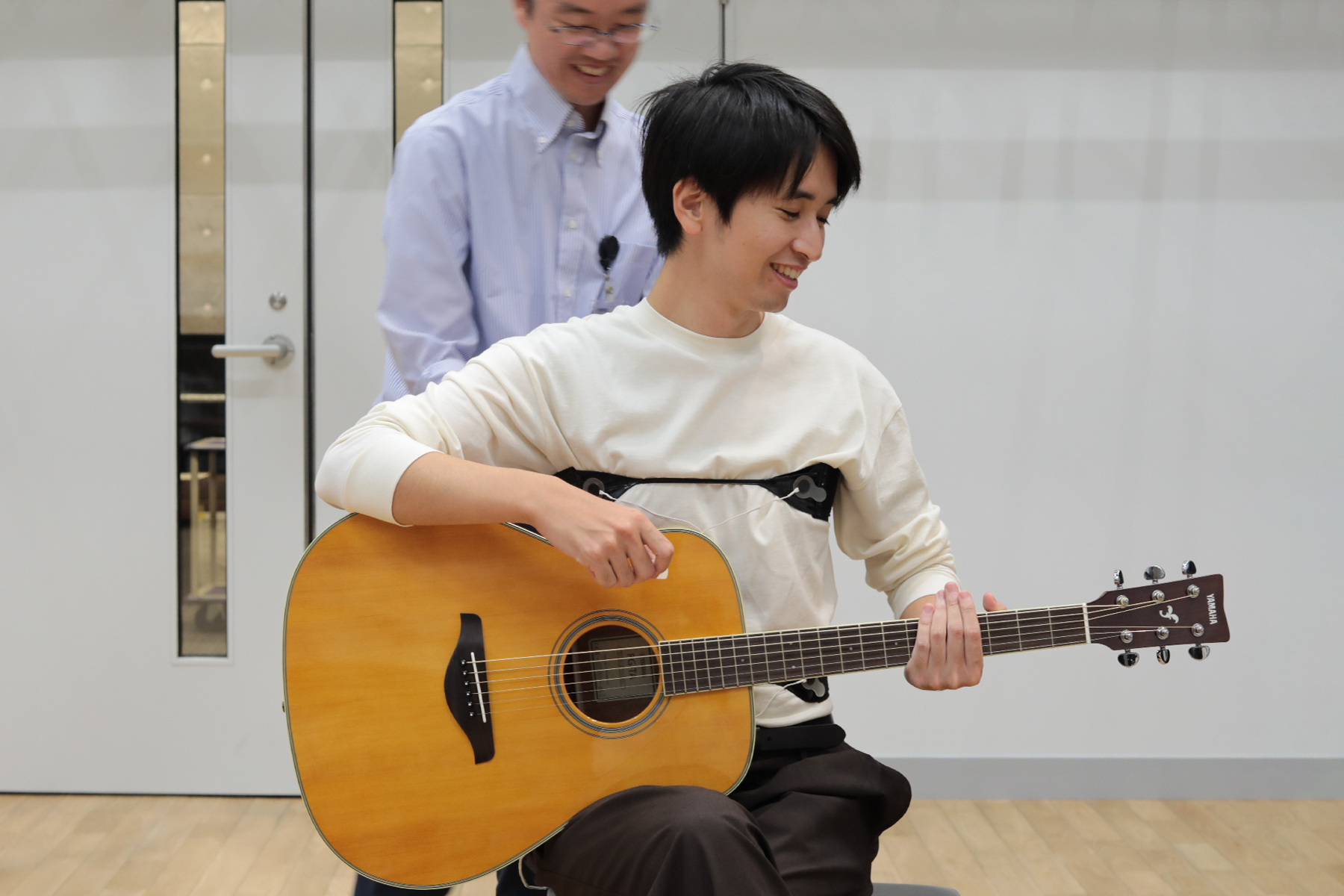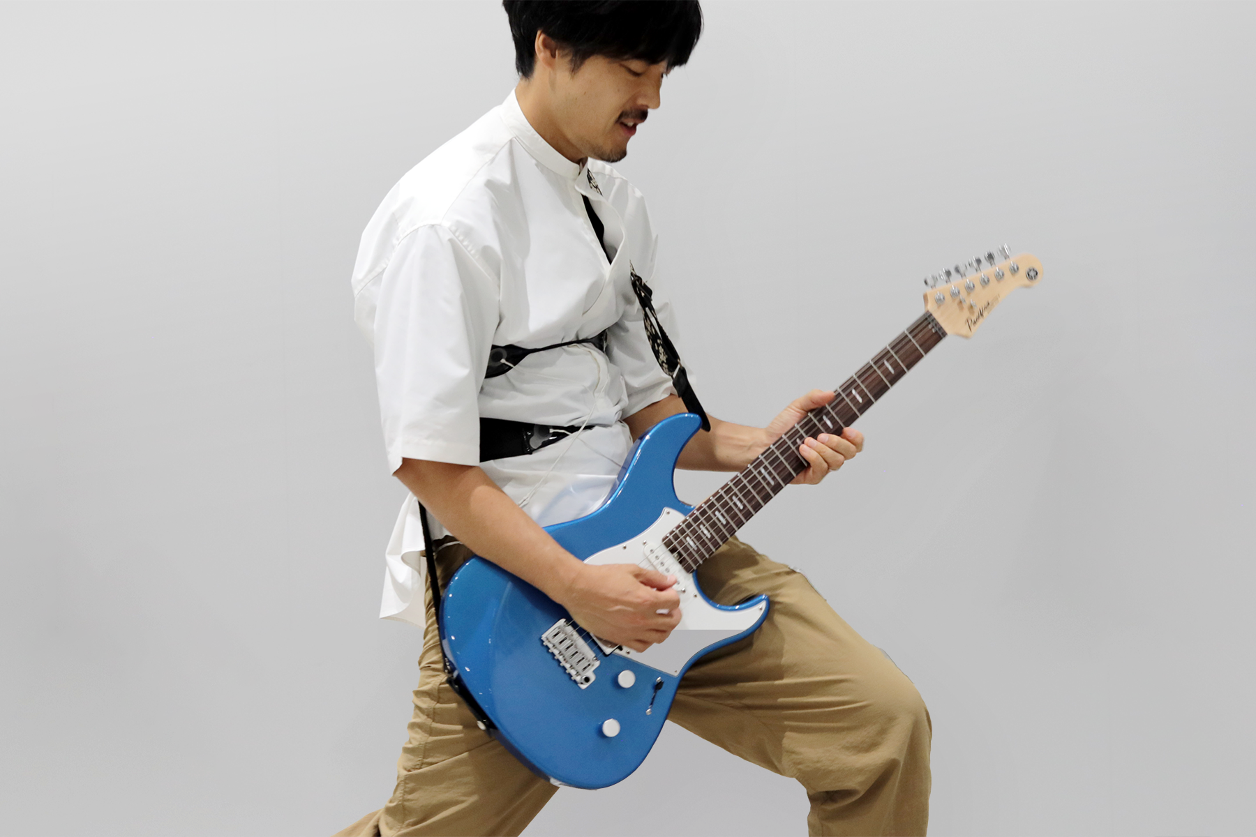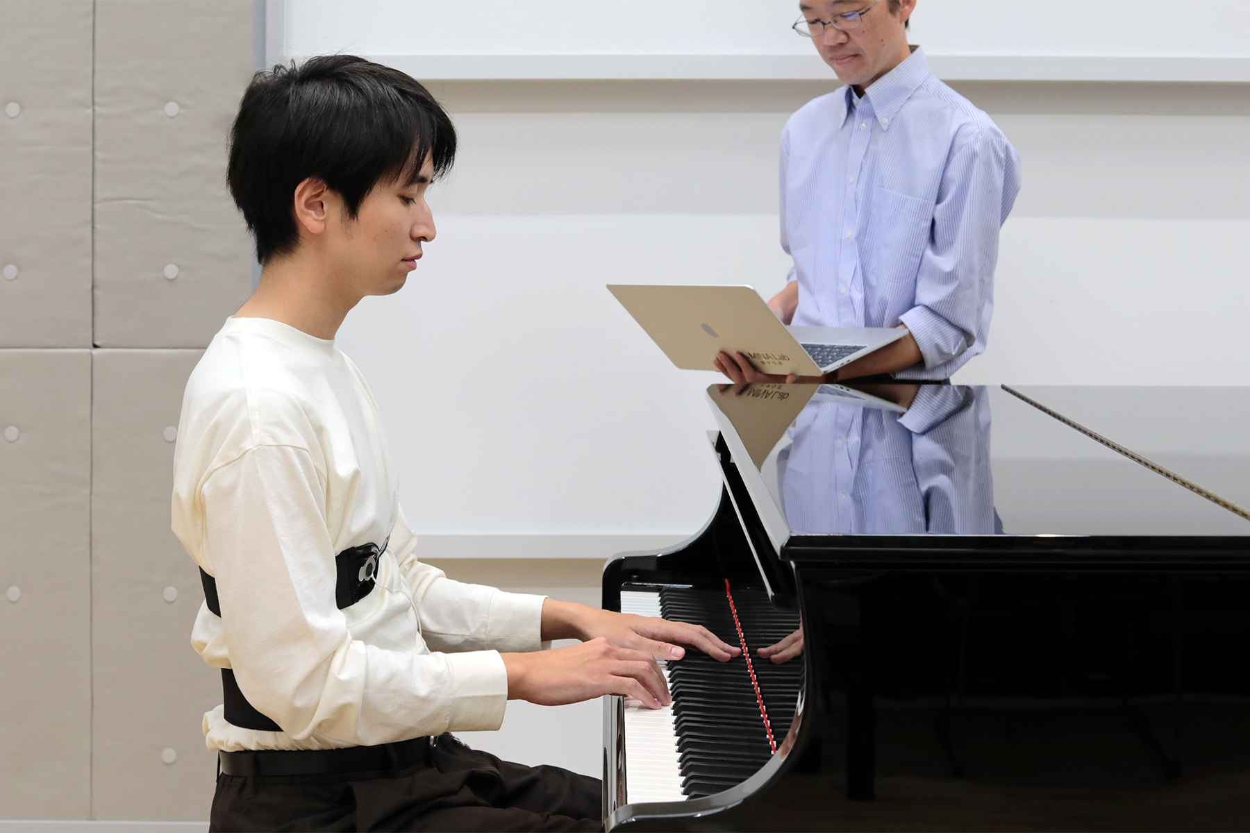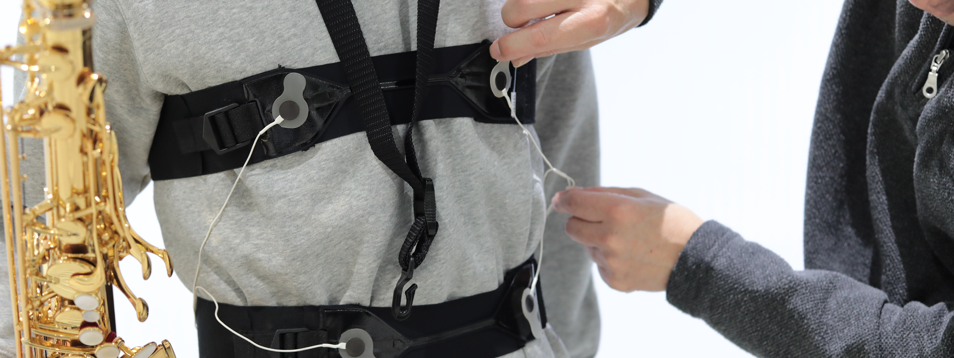 楽器演奏者の呼吸も、表現や音色と密接に関わっていると言われています。この関係性を、演奏者のポテンシャルを完全に引き出した状態で解明するためには、演奏者の呼吸動作を負荷なくセンシングする必要があります。そこで、ヤマハでは奏者にとって違和感のない呼吸計測を目指し、カーボンナノチューブを用いた抵抗変化型の伸縮センサー「GummiStra®」を活用し、演奏者の胸部と腹部の動きや呼吸パターンのリアルタイム計測技術の研究に取り組んでいます。この技術は管楽器、ピアノやギターといった、あらゆる楽器演奏と呼吸の関係を解明する可能性があります。