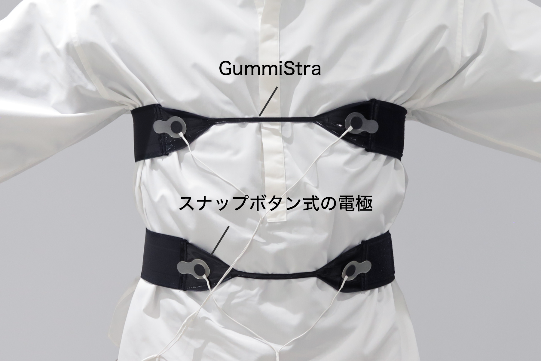 こうした課題の解決に役立ったのが、以前からヤマハが開発を進めてきた独自の伸縮センサー「GummiStra」でした。その最大の特徴は、ゴムのように伸び縮みし、人体に装着しても違和感が少ないことにあります。GummiStraは元々、2012年から行っているセンサー素子の研究を発端に、2017年からは医療機器への展開を目指して開発を進め、術後患者の呼吸モニタリングや呼吸リハビリテーションの定量評価など、医療現場での活用を検討を続けてきたセンサーです。